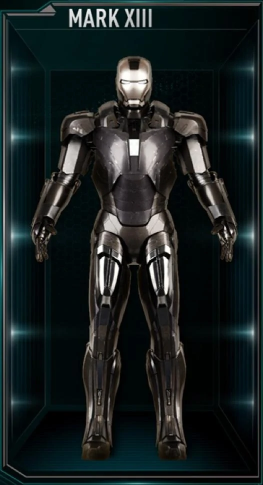Mark XIII는 알루미늄과 티타늄 강철을 사용하여 전체 갑옷을 더 가볍게 만들고 Tony Stark를 전투에서 더 잘 보호합니다. 그 결과 이전 모델보다 훨씬 빠르고 공기 역학적인 슈트가 탄생했습니다. 또한 아크 리액터용 직사각형 가슴 부분이 특징인 최초의 아이언맨 슈트이기도 합니다.