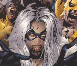 좀비 전염병이 닥치기 전 블랙캣의 역사는 그녀의 616 상대와 매우 유사합니다. 그녀는 꽤 일찍 전염병에 감염된 슈퍼 히어로 중 한 명이었고 Spider-Man과 Ashley J. Williams가 Iron Fist를 감염시킨 것으로 보이며 나중에 Quicksilver가 Scarlet Witch를 공격하는 것으로 보입니다. 그녀는 결국 Baxter Building을 공격하는 좀비 그룹의 일원이 되지만 나중에 Magneto에 의해 제지됩니다. Black Cat의 운명은 아직 알려지지 않았지만 Power Cosmic Zombies가 얻은 새로운 힘을 시도했을 때 그녀가 튀겨 졌다고 가정할 수 있습니다.