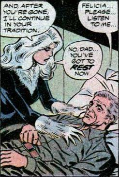 결국 Felicia는 그녀의 슈퍼 히어로와 범죄 활동에 싫증이 나고 은퇴를 위해 돈을 모으기 시작했습니다. 스파이더맨으로 변장한 오토 옥타비우스는 안나 마리아 마르코니와 데이트를 하러 가던 중 강도를 당한 펠리시아와 마주친다. Felicia는 그가 진정 누구인지 깨닫지 못한 채 그와 바람을 피우려고했고 그녀의 문제로 인해 이빨을 뚫고 Felicia는 완전히 충격을 받고 화를 내며 Otto가 그녀를 가죽 끈으로 감싼 후 복수를 맹세했습니다.