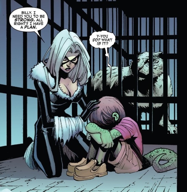 포로 상태에서 그녀는 불완전한 클론 세포를 안정화하기 위해 Lizard 공식을 받은 Curt Connors 의 클론 아들인 Billy Connors를 돌보았습니다. 실제로 추적자였던 Spidey의 선물을 사용하여 그녀는 그에게 SOS 메시지를 받을 수 있었습니다. 불행히도 이것은 Kraven의 계획의 일부였습니다. 특히 Cat과 Billy는 Spider-Man을 유인하기 위한 것이었습니다.